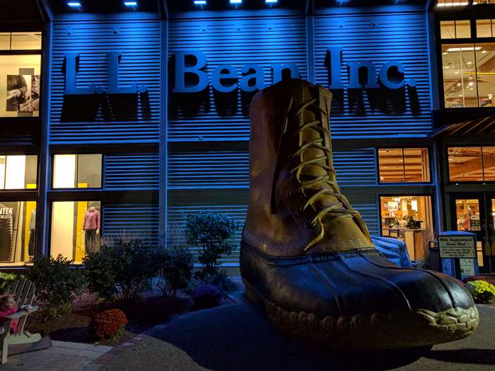 A towering replica of LL Bean’s famous waterproof boot greets visitors outside the main entrance to the main store, in the heart of Freeport, Maine. Take a selfie while sitting on the toe, then head inside.